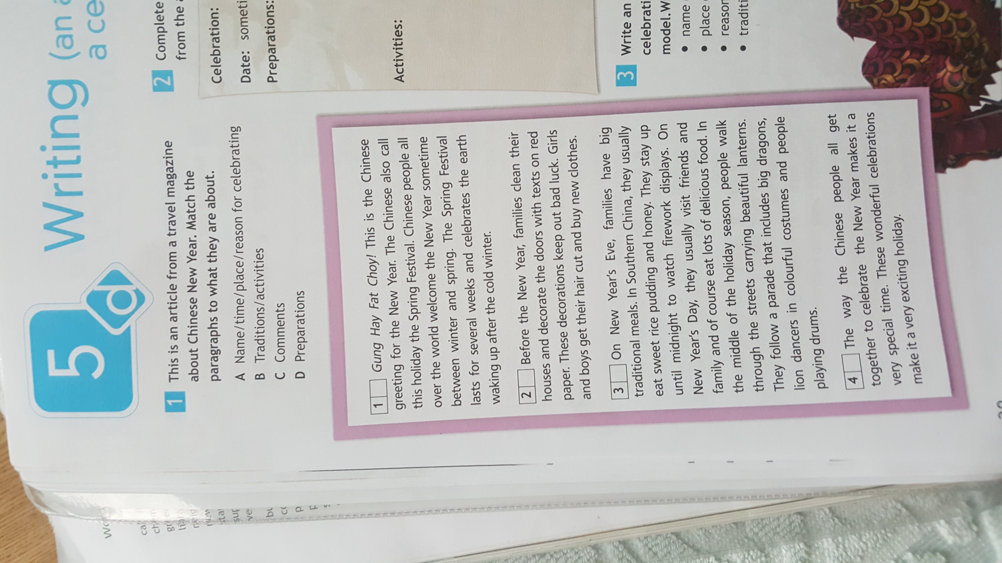 B) On New Year’s Eve, families have big traditional meals. In Southern China, they usually eat sweet rice pudding and honey. They stay up until midnight to watch firework displays. On New Year’s Day, they usually visit friends and family and of course eat lots of delicious food. In the middle of the holiday season, people walk through the streets carrying beautiful lanterns. They follow a parade that includes big dragons, lion dancers in colourful costumes and people playing drums.