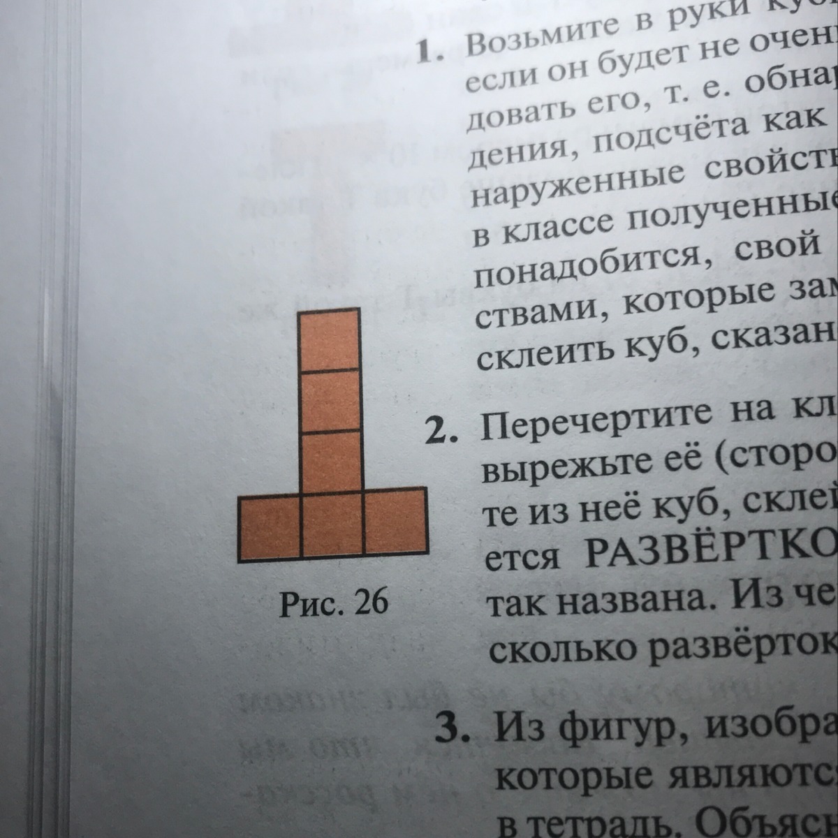Перечертите на клетчатую бумагу фигуру(рис.26) и вырежьте её(сторона каждого квадрата 4 см).Сверните из неё куб,склейте его.Вырезанная фигура называется РАЗВЁРТКОЙ КУБА.Подумайте,почему она так названа.Из чего она состоит?Придумайте ещё несколько развёрток куба и начертите их в тетради.