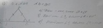 треугольник ABC AB = BC a) Док-ть что <3 = <4 б)найти <3, если <2 = 40 градусов c)Найти <1, если <4 = 110