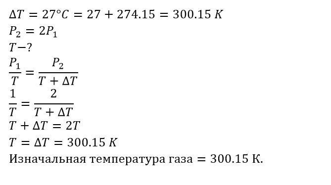 При какой температуре находится газ в закрытом сосуде если при нагревании его на 27° давление возросло в 2 раза .