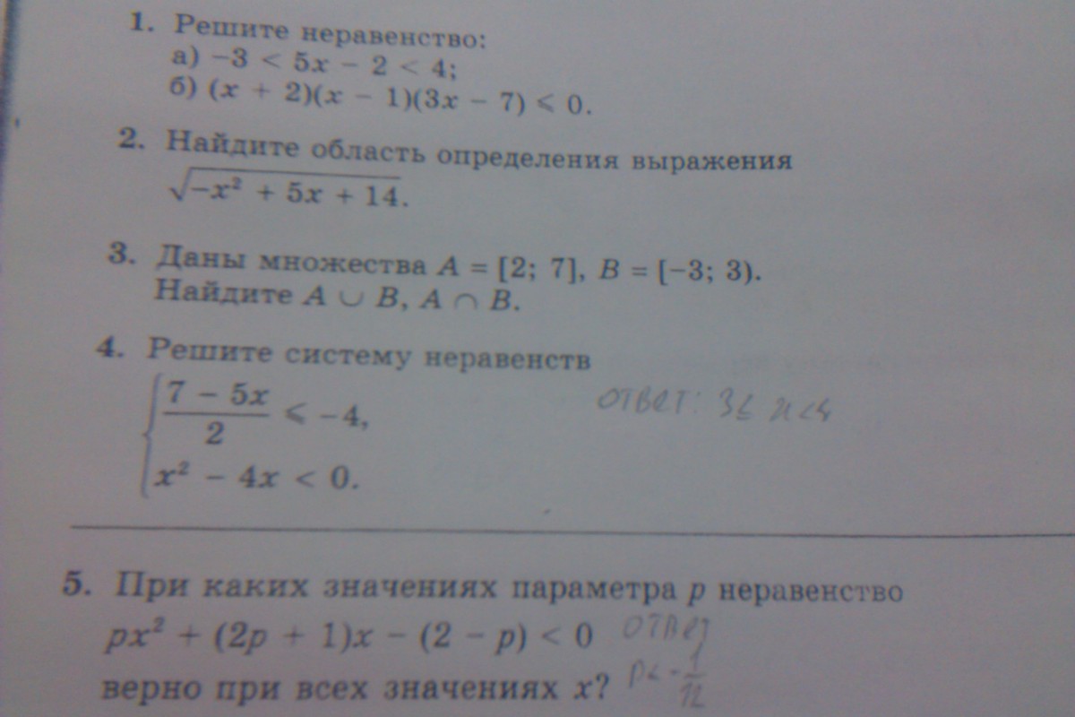 ну там 1 задание (б) получается (х+2)(х-1)(3х-7)меньше или равно нулю каждую скобку приравниваем к нулю получаем х+2=0 х=-2 ; х-1=0 х=1; 3х-7=0 3х=7 х=7/3(дробь) х=2 1/3 изображаем прямую на ней эти три точки изображаем интервалы штрихуем минус ответ будет (-бесконечность;-2);(1;2 1/3) где -2 ,1 и 2 1/3 скобки квадратные