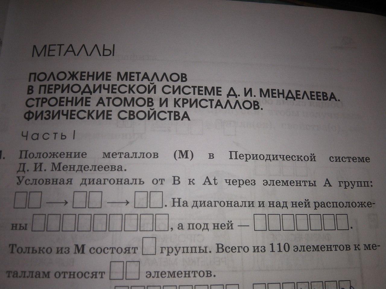 Условная диагональ от B к At через элементы А групп: Si, As, Te. На диагонали и над ней расположены неметаллы, а под ней - металлы. Только из М состоят В группы. Всего к металлам относят 82 элемента. В неметаллах присутствуют ковалентные связи, в металлах - металлические. Металлы - блестящие, твердые вещества, проводят электрический ток, пластичны. Неметаллы не проводят ток, большинство из них - газы и жидкости. Число электронов во внешнем слое атома металла - 1 или 2, иногда 0.