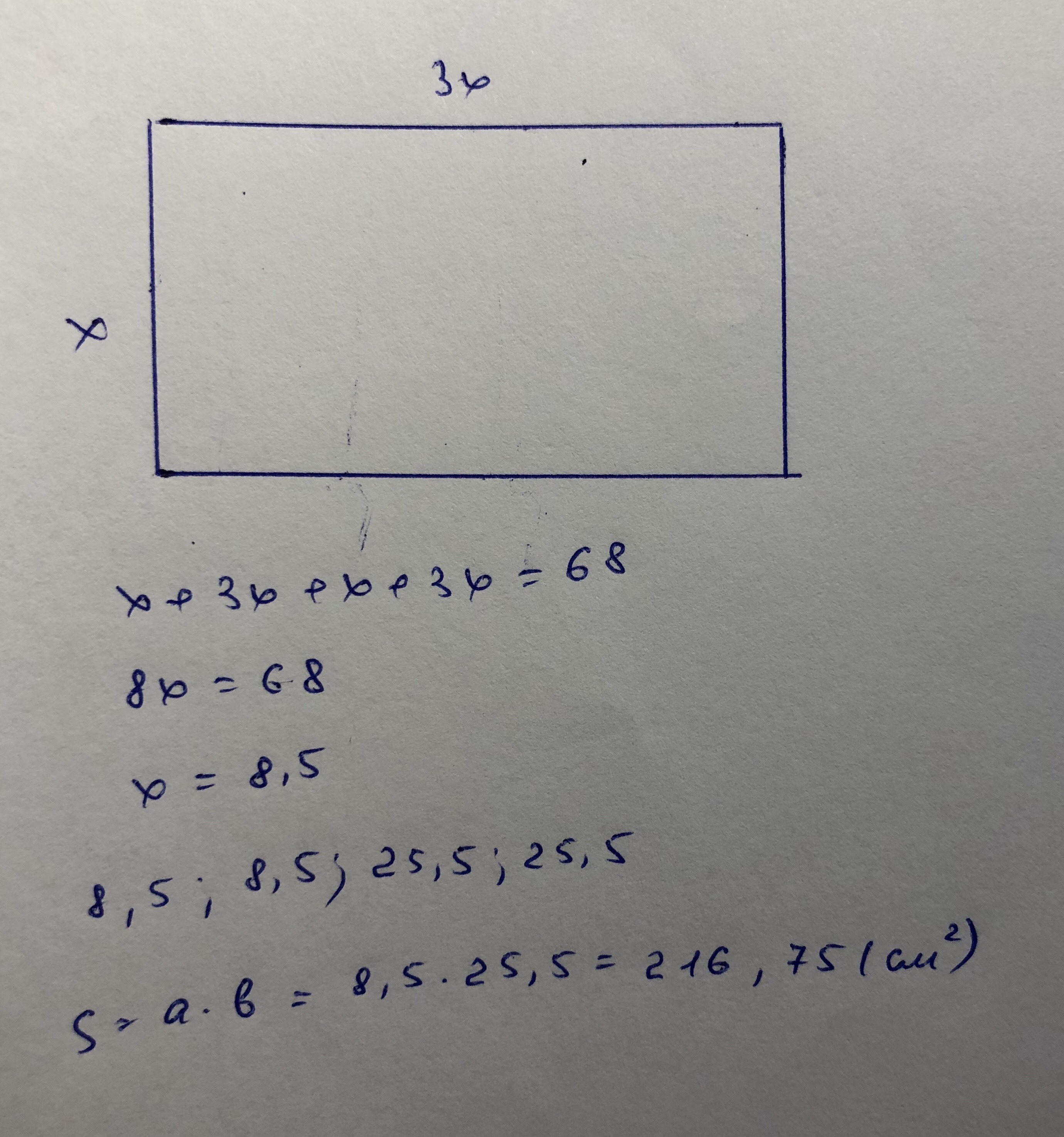 Одна из сторон прямоугольника в 3 раза больше другой.Найти площадь прямоугольника,если его периметр равен 68 см.