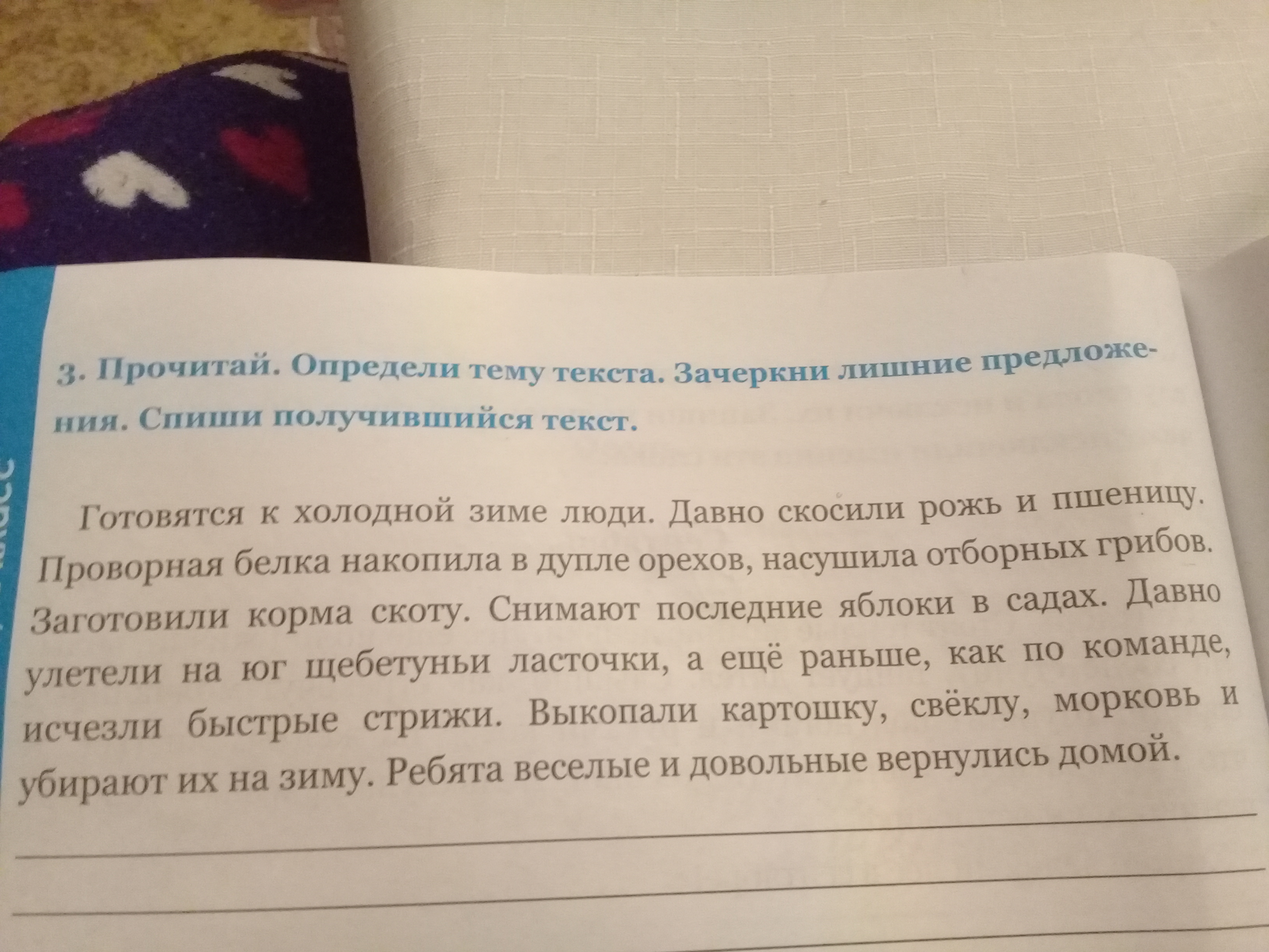 Лишнии: 1)проворная белка накопила... 2) давно улетели на юг щебетуньи ласточки, а ещё раньше, как по команде, исчезли... 3)ребята весёлые и довольные....