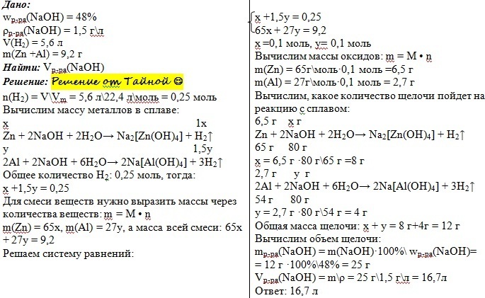 Смесь алюминия и цинка массой 9,2 г обработали раствором гидроксида натрия с массовой долей NaOH 48% и плотностью 1,5 г/мл. При этом выделился газ объемом 5,6 л. Сколько миллилитров раствора щёлочи пошло на растворение алюминия?