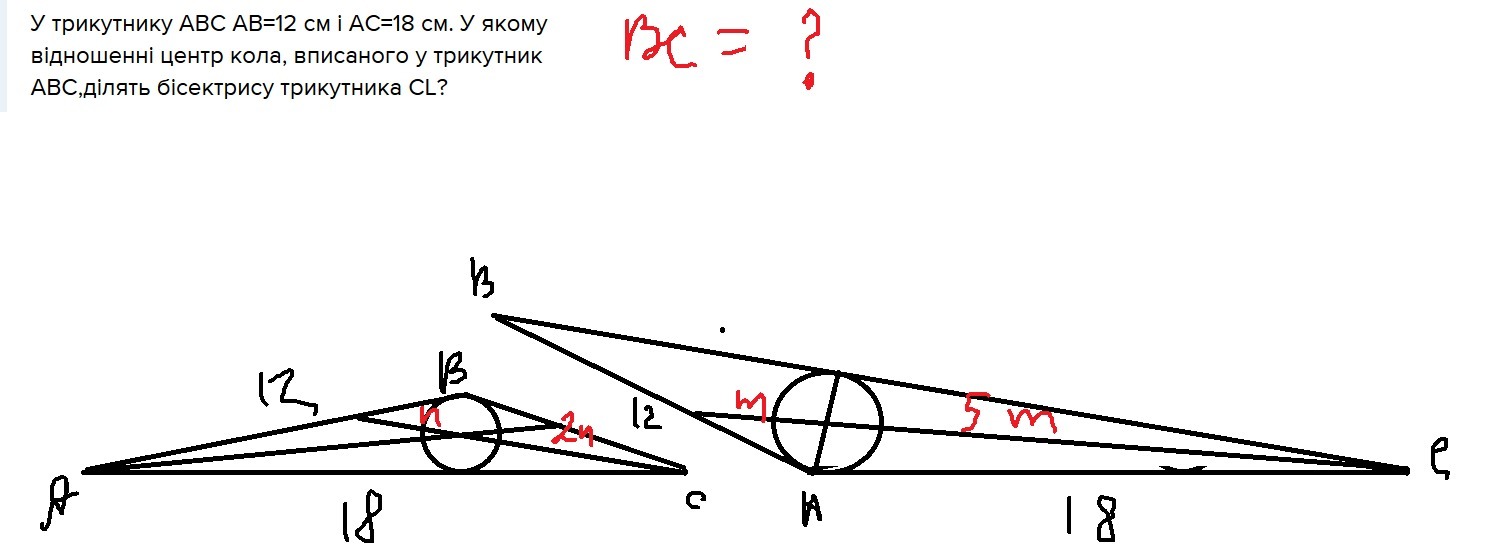 У трикутнику АВС АВ=12 см і АС=18 см. У якому відношенні центр кола, вписаного у трикутник АВС,ділять бісектрису трикутника СL?