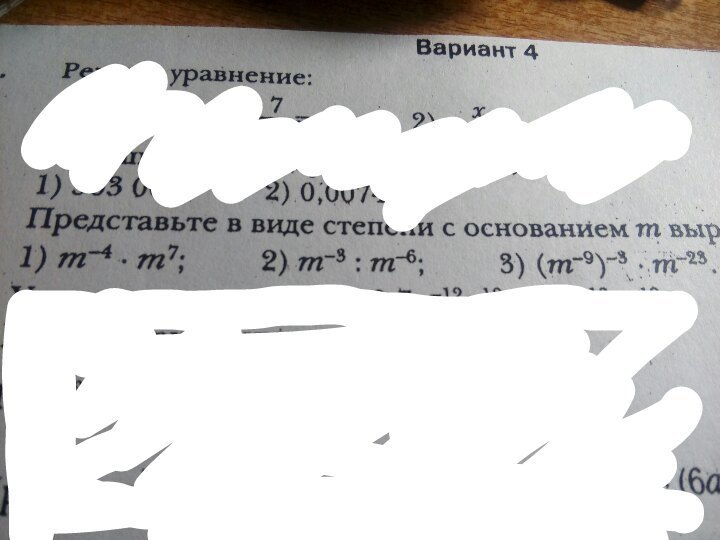 m^{-4}cdotm^7=m^{-4+7}=m^3\m^{-3}:m^{-6}=m^{-3-(-6)}=m^{-3+6}=m^3\(m^{-9})^{-3}}cdot m^{-23}=m^{-9cdot(-3)+(-23)}=m^{27-23}=m^4