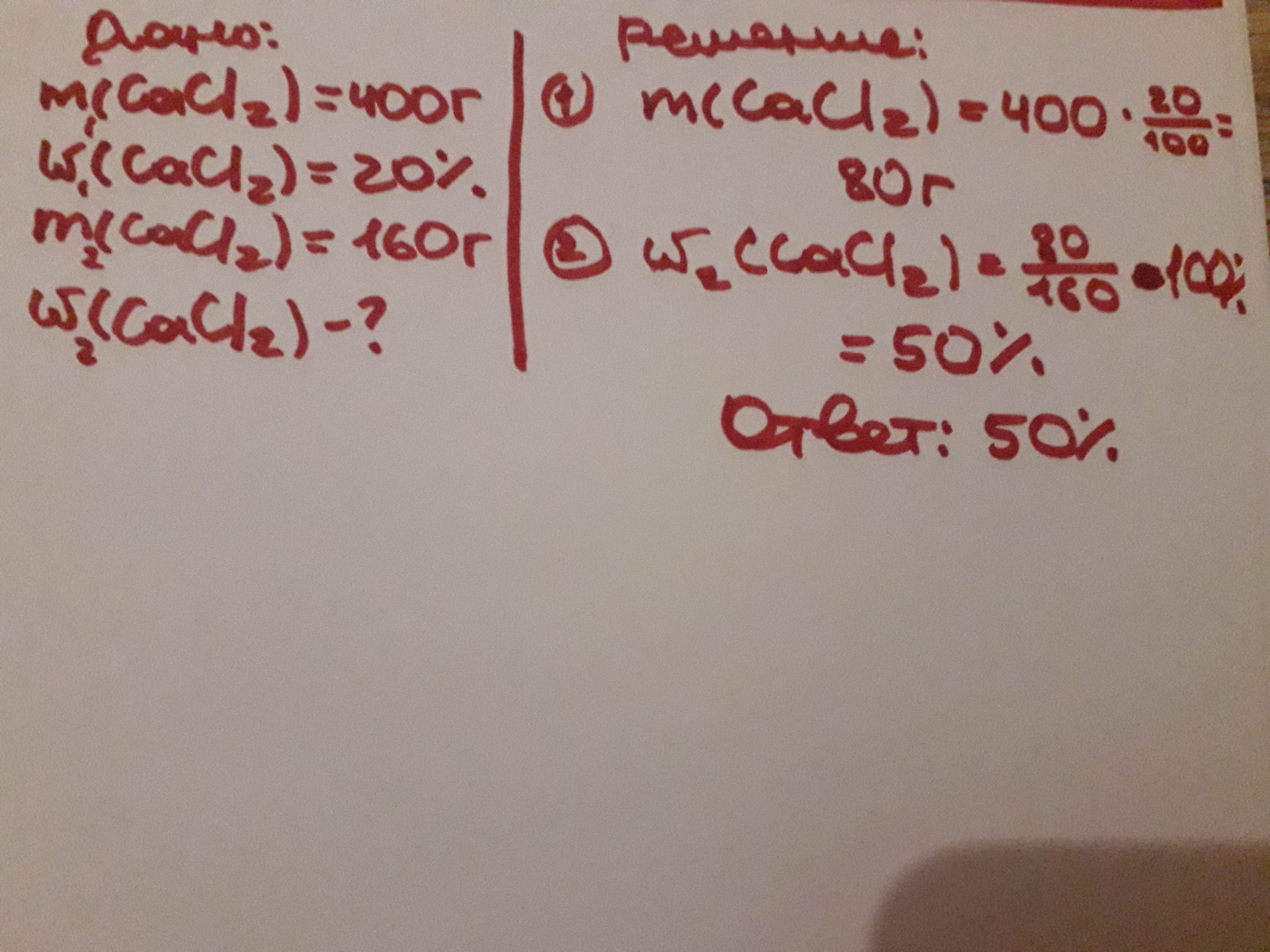 При упаривании раствора хлорида кальция (CaCl2) массой 400г с массовой долей 20% CaCl2 получен расствор массой 160 г. Какова массовая доля (CaCl2) в растворе