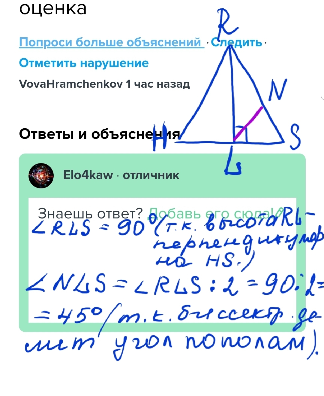 в треугольнике HRS проведена высота RL,а в треугольнике RSL биссектриса LN. Найти угол NLS. Пожалуйста решите, умоляю на кану четвертная оценка