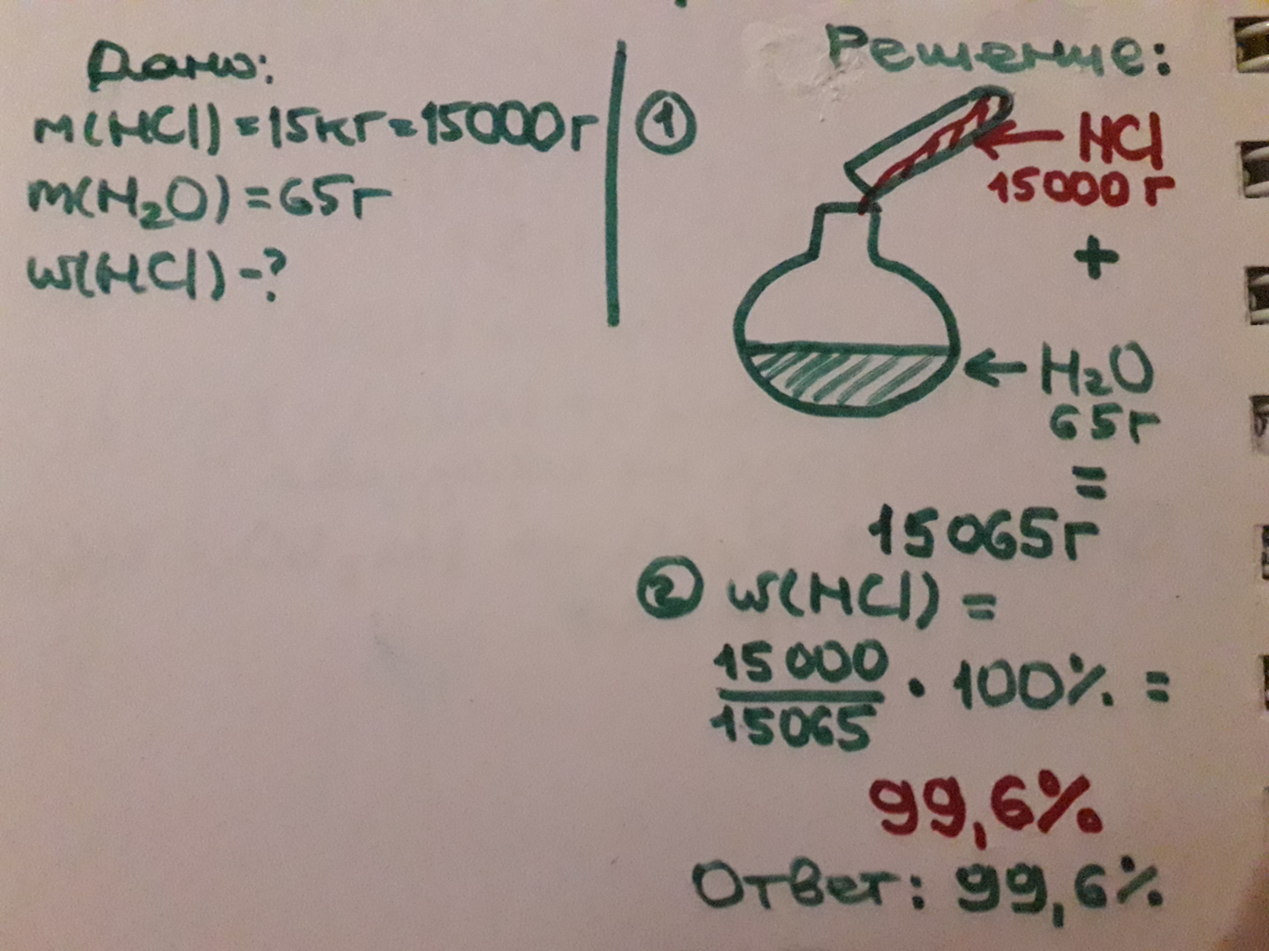 Какова массовая доля вещества в растворе, если для его приготовления взяли СОЛЯНУЮ КИСЛОТУ массой 15КГ и воду массой 65Г