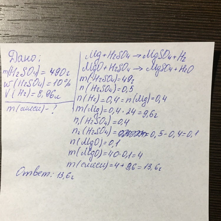 Смесь магния и оксида магния полностью растворяется в 490 г 10% раствора серной кислоты. При этом выделяется 8,96 л (н.у.) газа. Найдите массу (в граммах) исходной смеси. Ответ приведите в виде числа с точностью до десятых. Спасибо
