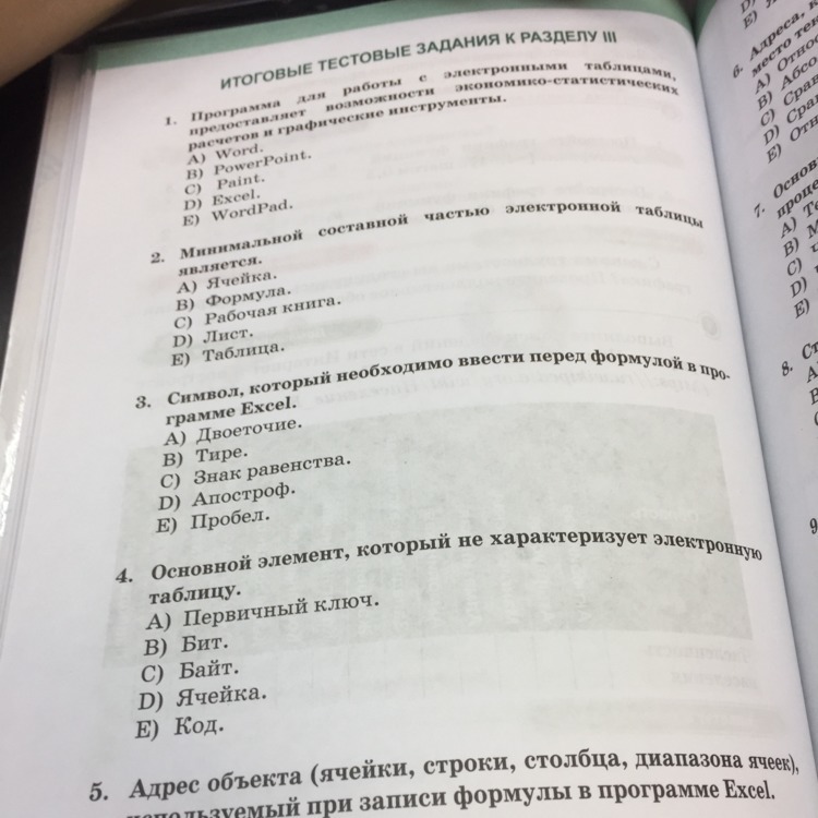 1.Excel 2.Ячейка 3.Кажется двоеточие 4.Точно не знаю