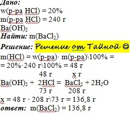 Вычислить массу средней соли, которая образуется в результате взаимодействия 240 г 20% раствора соляной кислоты с барий гидроксидом