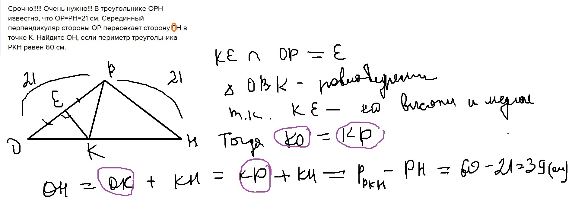 Срочно!!!!! Очень нужно!!! В треугольнике OPH известно, что OP=PH=21 см. Серединный перпендикуляр стороны OP пересекает сторону РН в точке К. Найдите ОН, если периметр треугольника РКН равен 60 см.