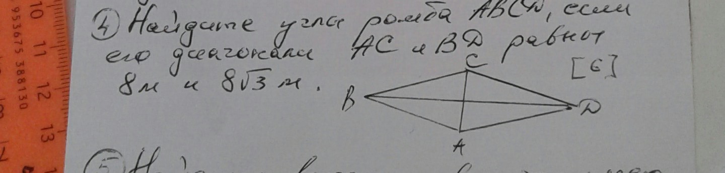 tg(<ABO) =tg(<60°), так же угол ADC=60°, т.к сумма углов в четырёх угольник равна 180°, то <BCD=1(80-2*60)/2=(180-120)/2=60/2=30°, угол Bad также равен 30 °