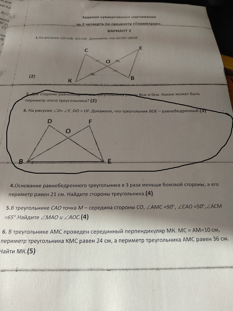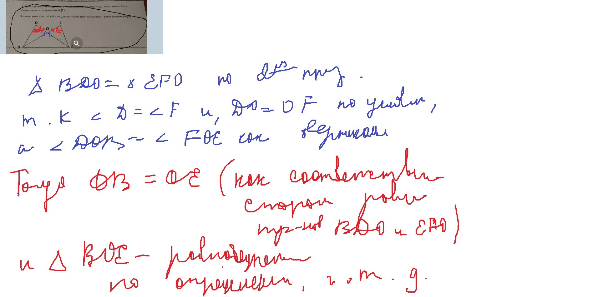 на рисунке угол D= углу F. DO=OF докажите что треугольник BOE равнобедренный