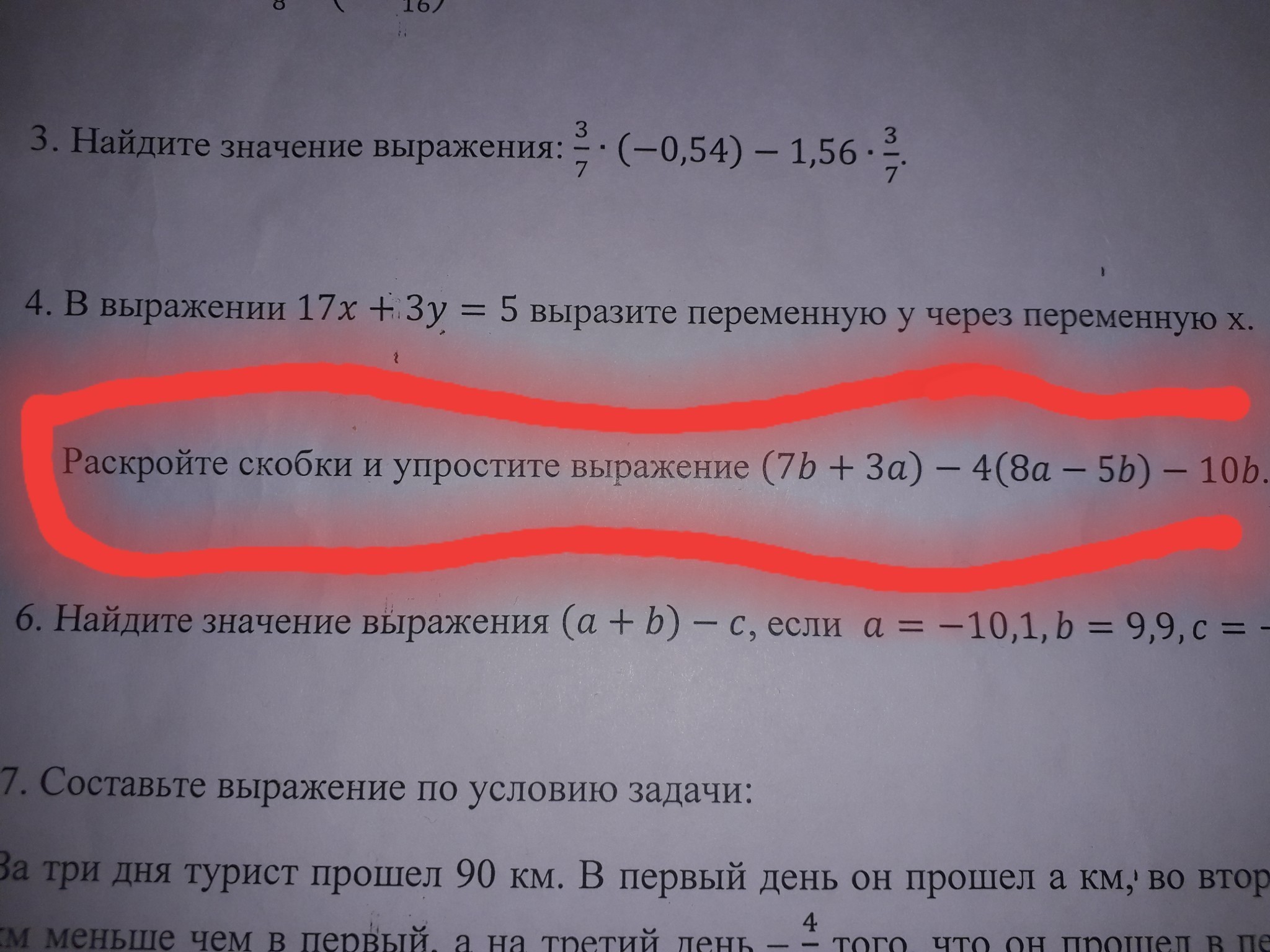 ( 7b + 3a ) - 4 ( 8a - 5b ) - 10b = 7b + 3a - 32a + 20b - 10b = 17b - 29a.