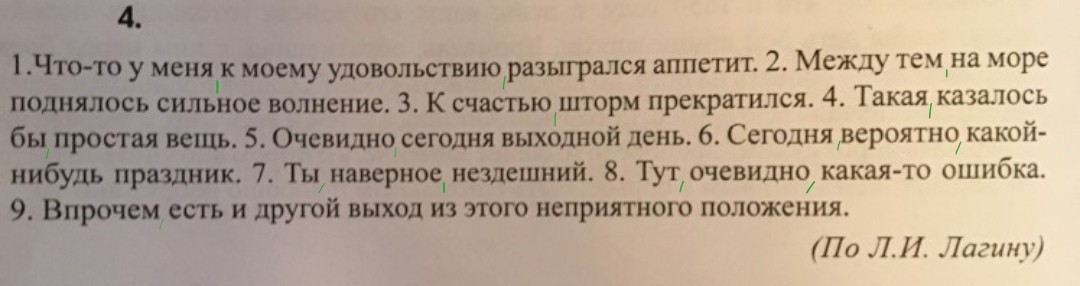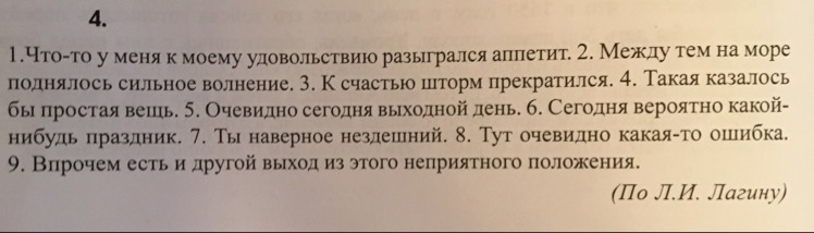 1.Что-то у меня, к моему удовольствию, разыгрался аппетит. 2.Между тем, на море поднялось сильное волнение. 3.К счастью, шторм прекратился. 4. Такая, казалось бы, простая вещь. 5.Очевидно, сегодня выходной день. 6. Сегодня, вероятно, какой-нибудь праздник. 7. Ты, наверное, здешний. 8. Тут, очевидно, какая-то ошибка. 9. Впрочем, есть и другой выход из этого неприятного положения.