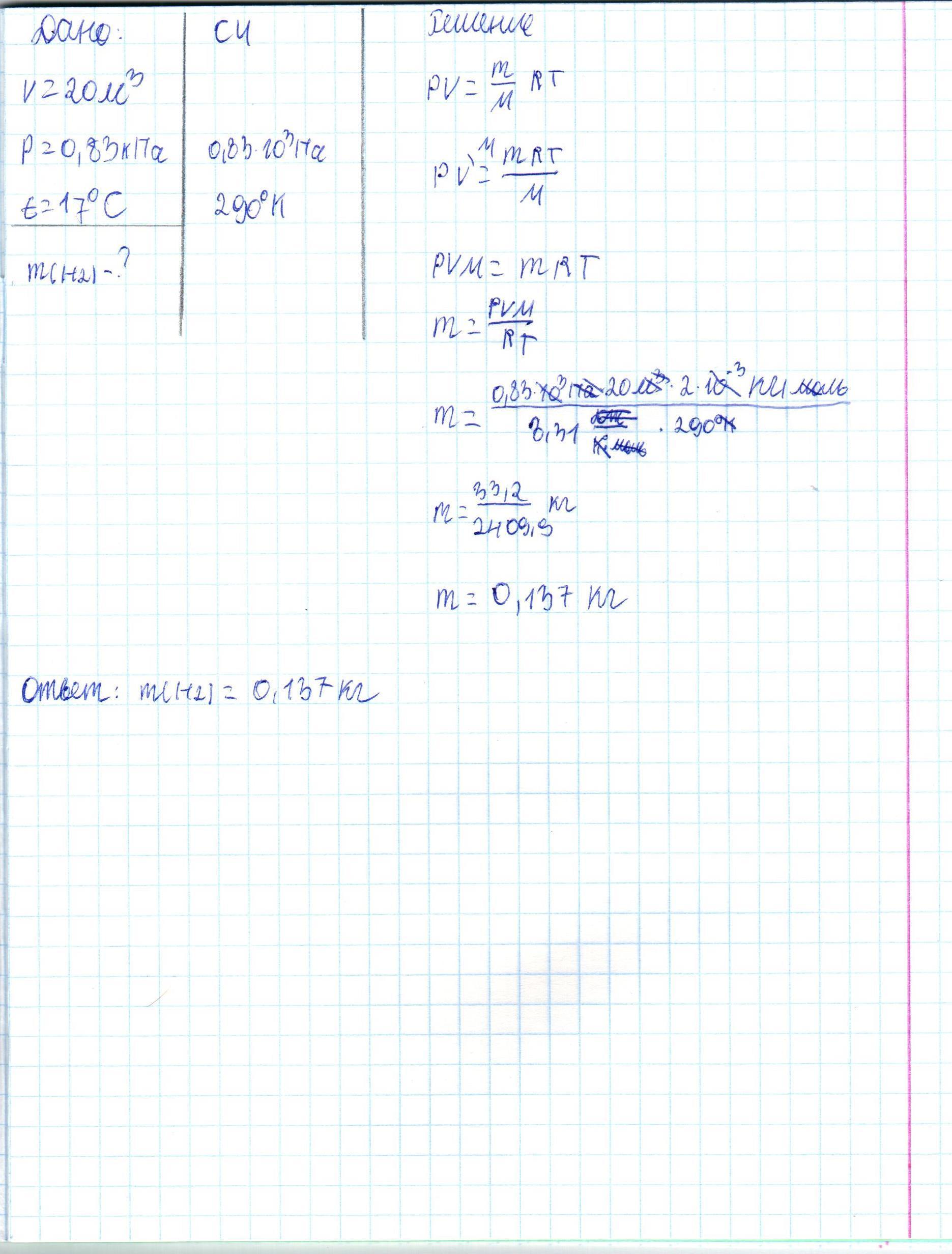 Определите массу водорода, находящегося в баллоне вместимостью 20м^3 под давлением 0,83 кПа при температуре 17°С
