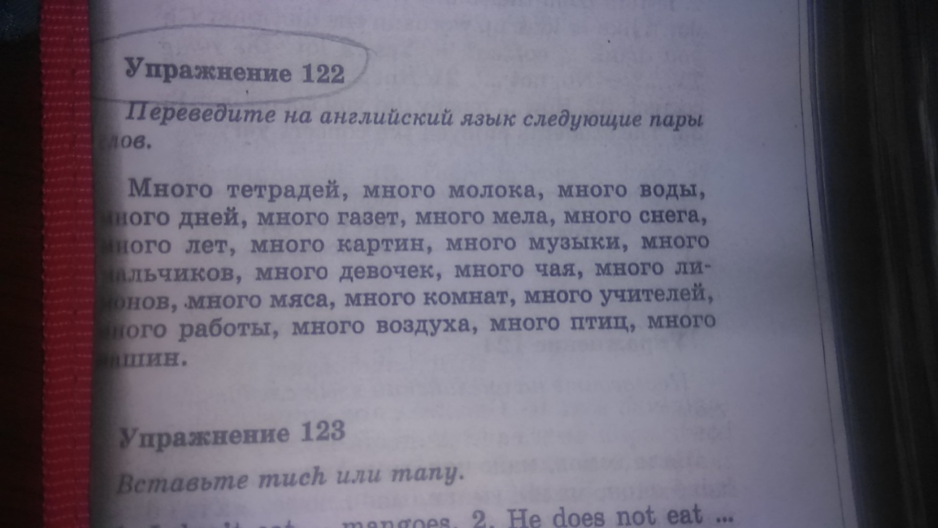 Many copybooks, much milk, much water, many days, many newspapers, much chulk ( тут возможно ощибаюсь), much snow, many years, many pictures, much music, many boys, many girls, much tea, many lemons, much meat, many rooms, many teachers, much work, much air, many birds, many cars