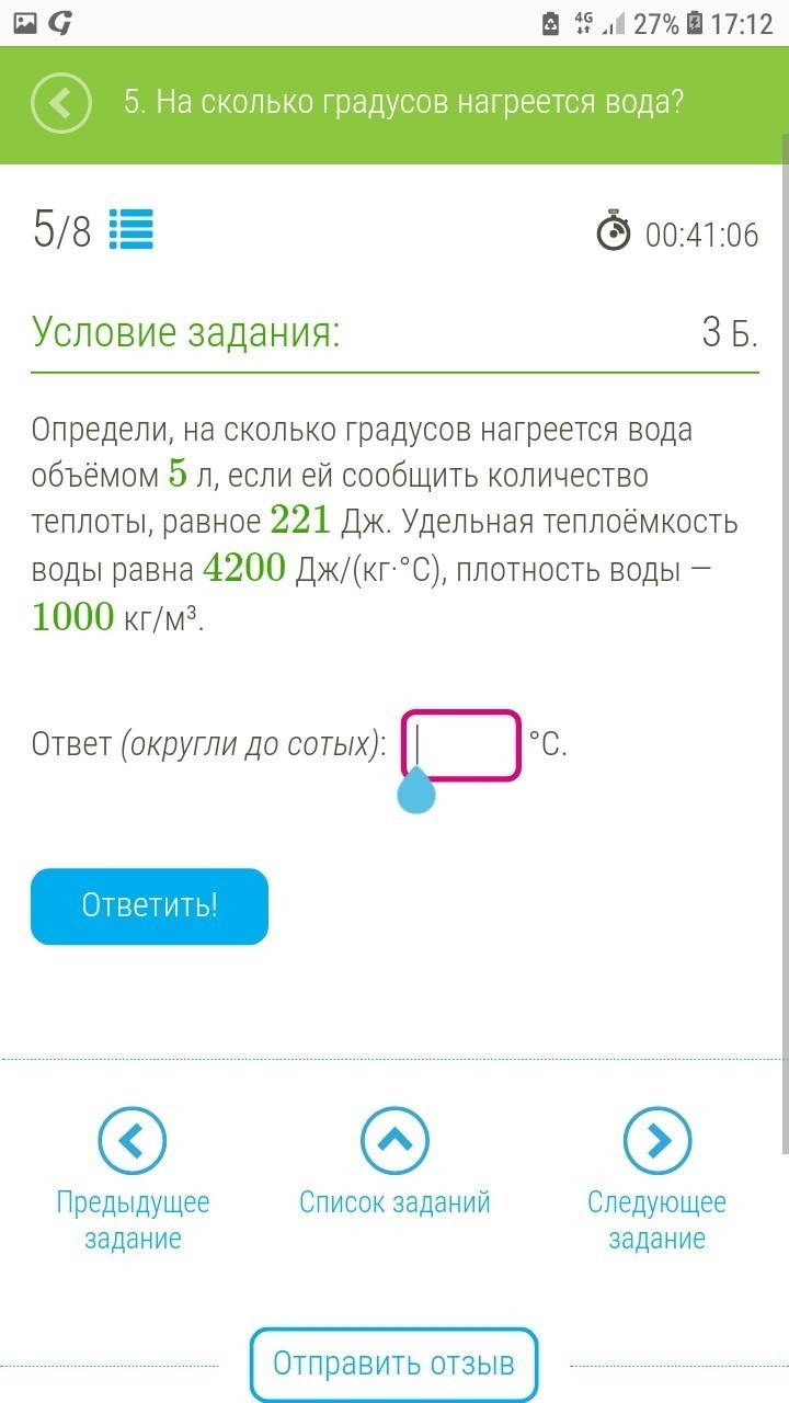 ∆t = Q/cm = 221/4200*5 = 221/21000 = 0,01°С.