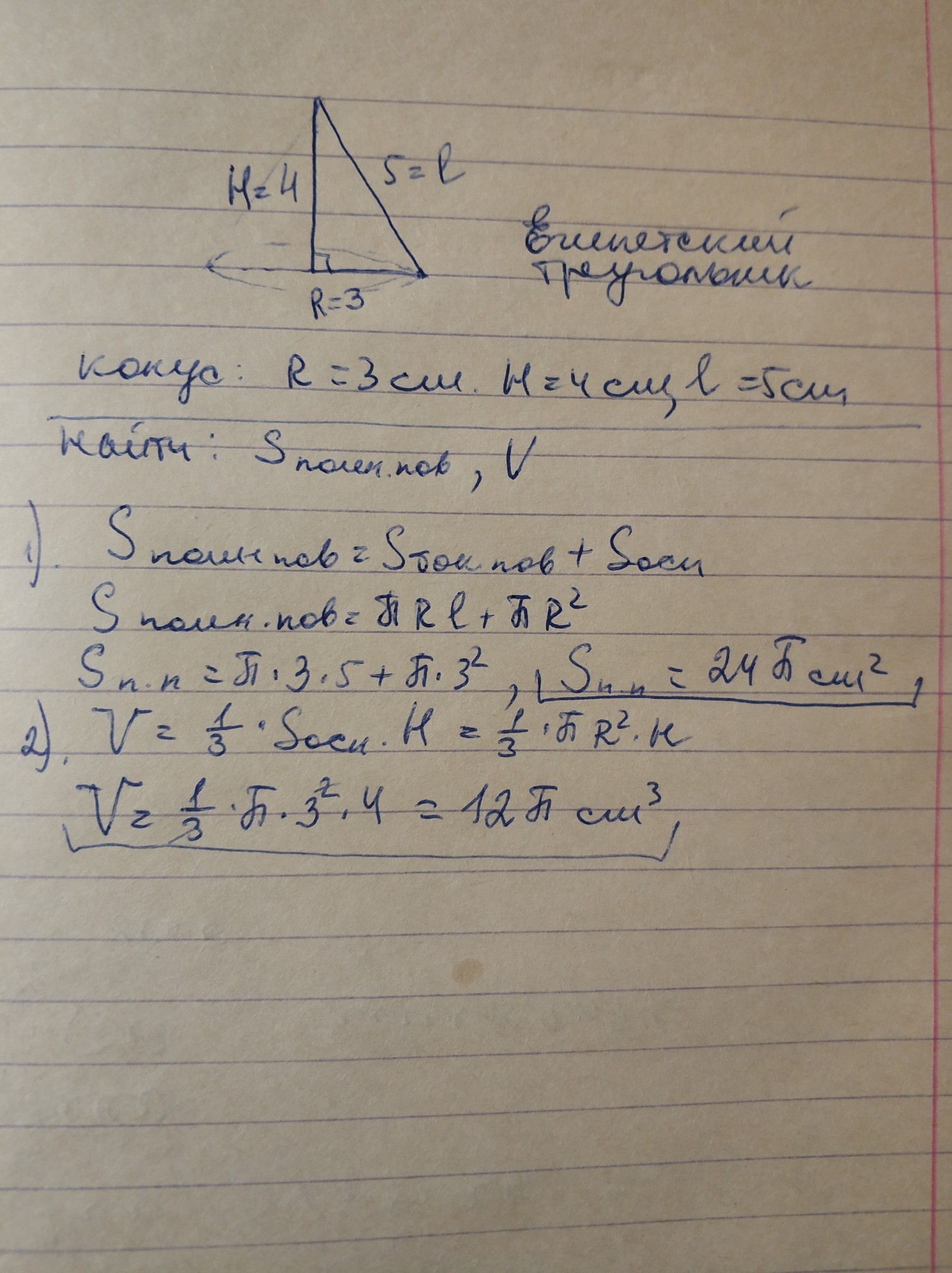 1. Найдите площадь полной поверхности и объем тела, полученного при вращении прямоугольного треугольника с катетом 4 см и гипотенузой 5 см вокруг его катета.