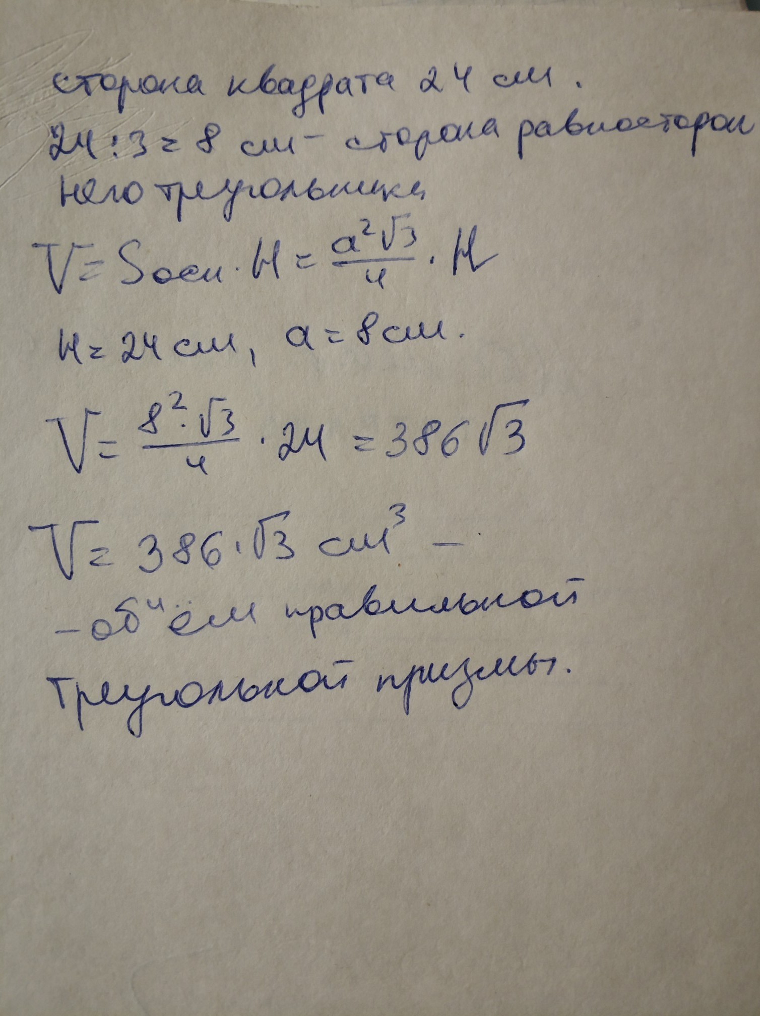 2. Квадрат со стороной 24 см свернут в виде боковой поверхности правильной треугольной призмы. Найдите объем этой призмы.