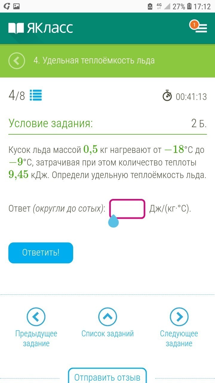 c=Q/(m*(t2-t1))=9450Дж/(0,5кг*(-9°C-(-18°C)))