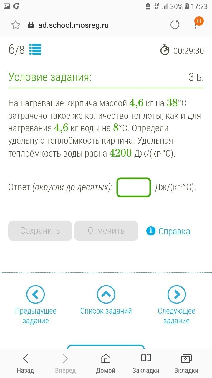 Ответ 884,2 Дж/кг*°C