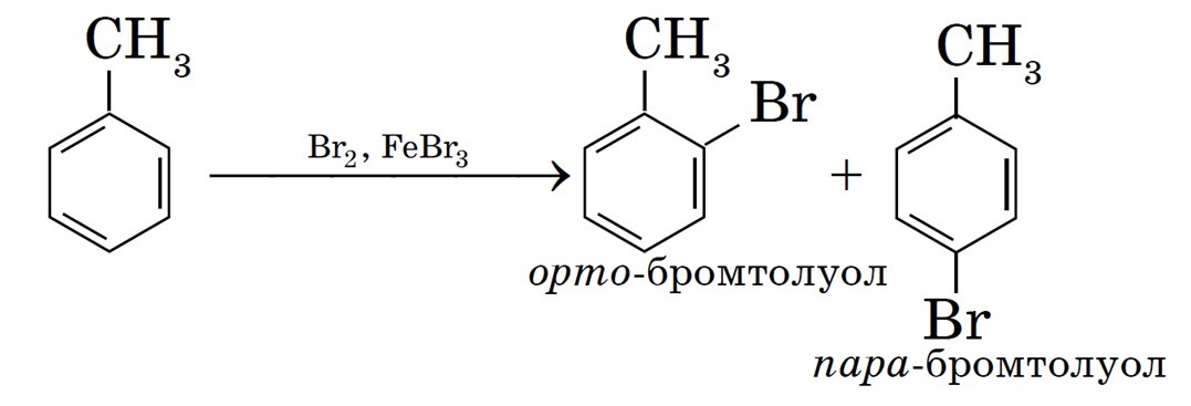 C₆H₅-CH₃ + Br₂ ---> 2C₆H₄Br-CH₃ (Kt=FeBr₃,t) (структурные формулы в фото)