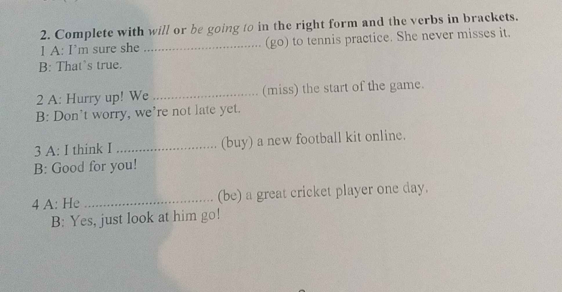 1 will go 2 are going to miss 3 will buy 4 is going to be