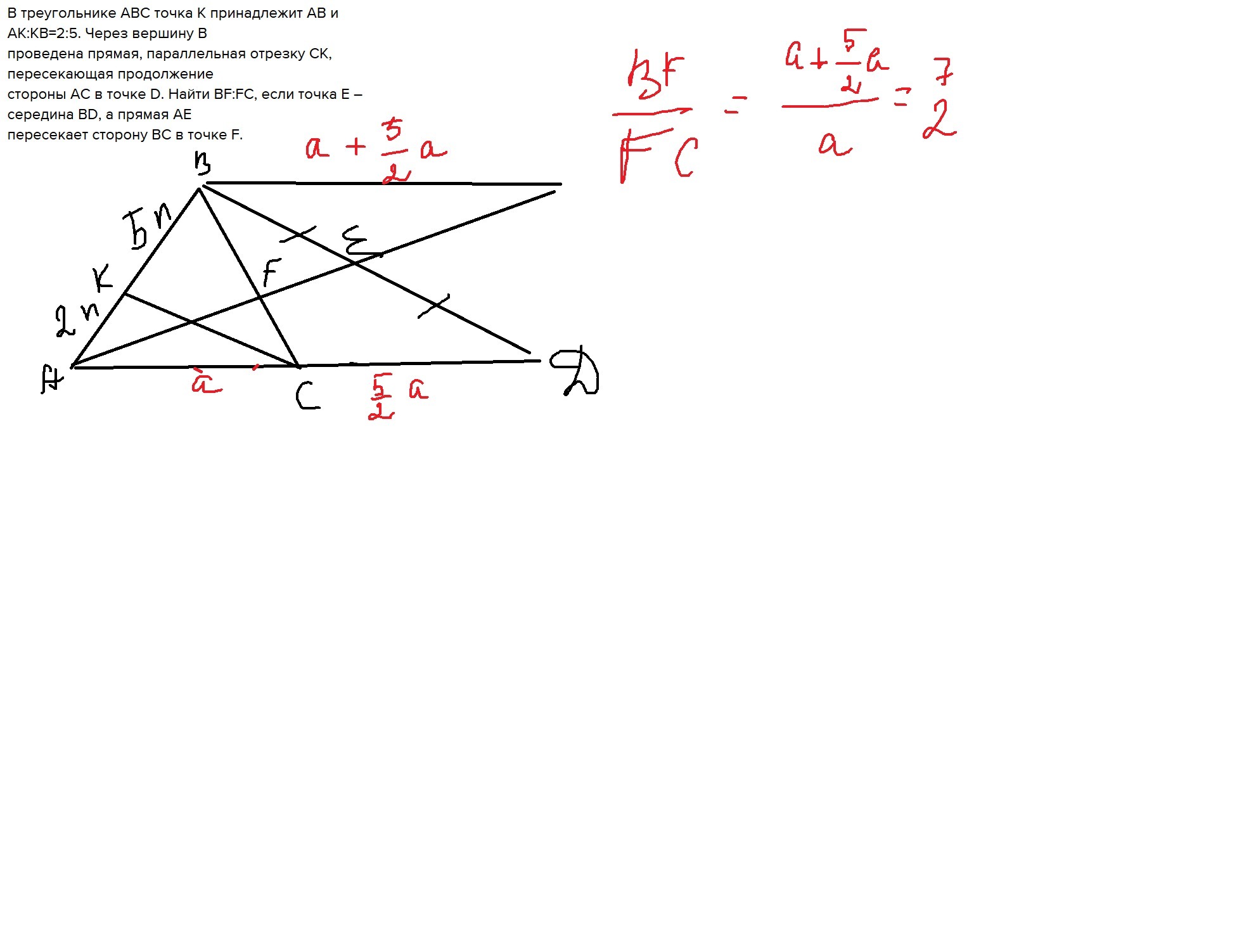 В треугольнике АВС точка К принадлежит АВ и АК:КВ=2:5. Через вершину В
