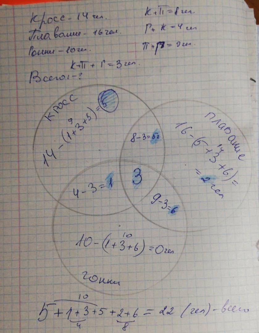 Четырнадцать спортсменов участвовали в кроссе, 16 – в соревнованиях по плаванию, 10 – в велосипедных гонках. Восемь участников участвовали в кроссе и заплыве, 4 – в кроссе и велосипедных гонках, 9 – в плавании и велосипедных гонках. Во всех трех соревнованиях участвовали три человека. Сколько всего было спортсменов?