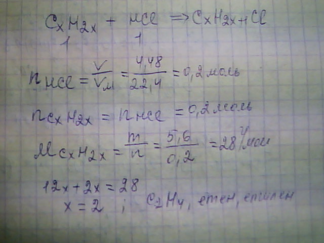 помогите с задачей: алкен масою 5,6 г приєднав 4,48 л хлороводню(н.у.). Знайдіть молекулулярну формулу сполуки (С2Н4)