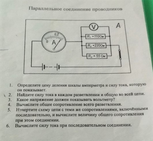 Чтобы найти напряжение найдём Re: Re=1/ 1/110+1/220+1/55=31.42om, зная ток по амперметру найдём напряжение на резисторах (считаем что источник идеальный, сопротивление амперметра не учитываем),