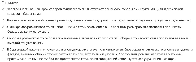 Готический стиль в основном проявился в архитектуре храмов, соборов, церквей, монастырей. В отличие от романского стиля с его круглыми арками, массивными стенами и маленькими окнами, для готики характерны арки с заострённым верхом, узкие и высокие башни и колонны.