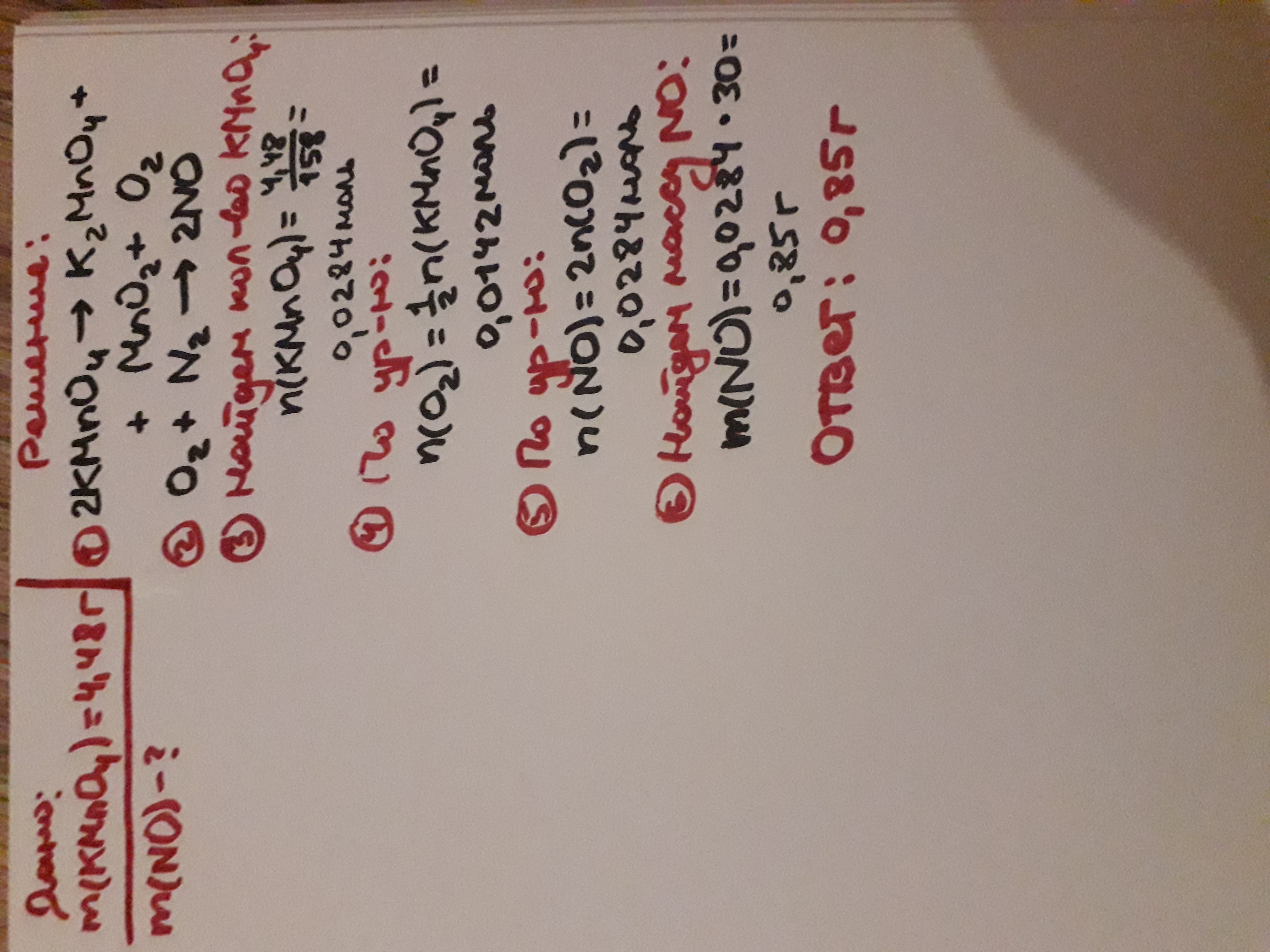 при разложении 4,48г перманганата калия выделился кислород,который полностью прореагировал азотом, с оброзованием оксида азот(II)NO .Расчитайте массу оксида азота(II) NO