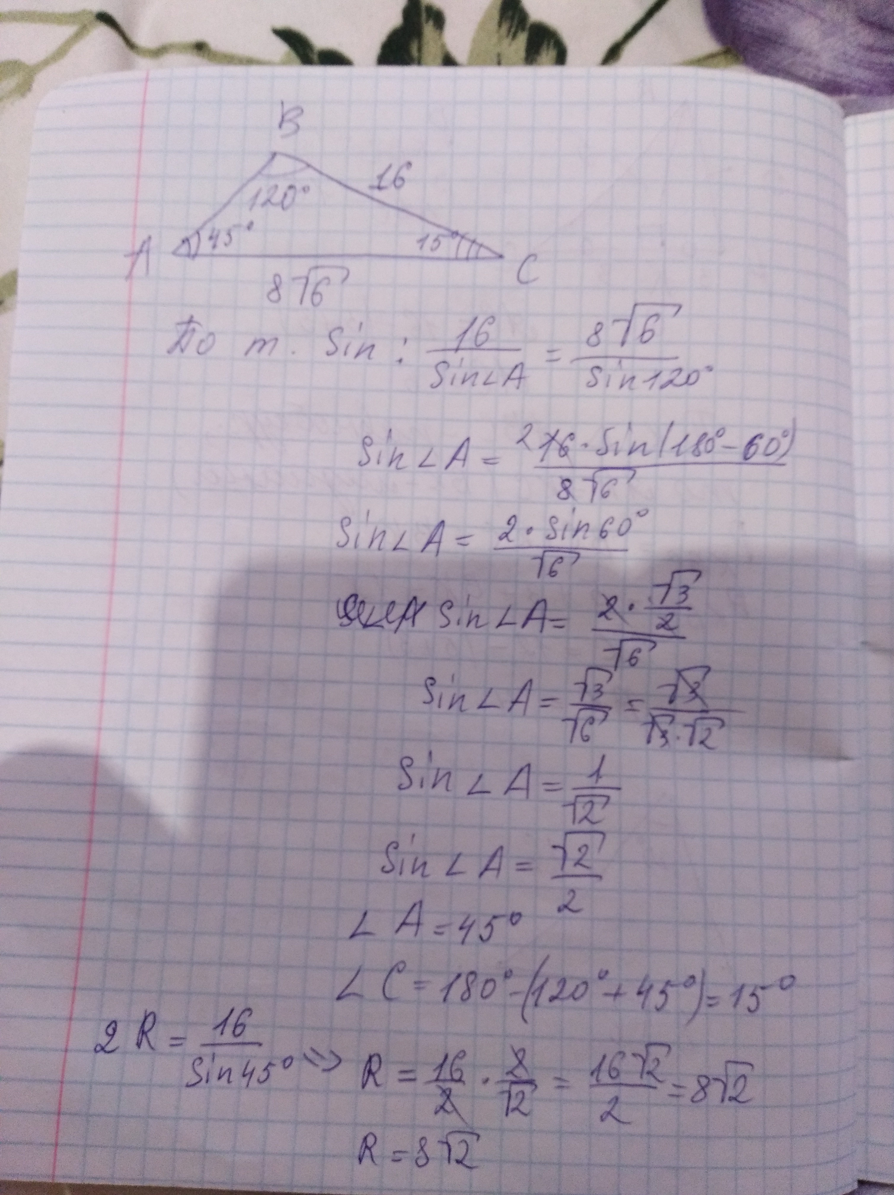 В треугольнике против угла 120° лежит сторона длинной 8√6, а вторая сторона равно 16 см. Найдите остальные углы треугольника и радиус описанной окружности.
