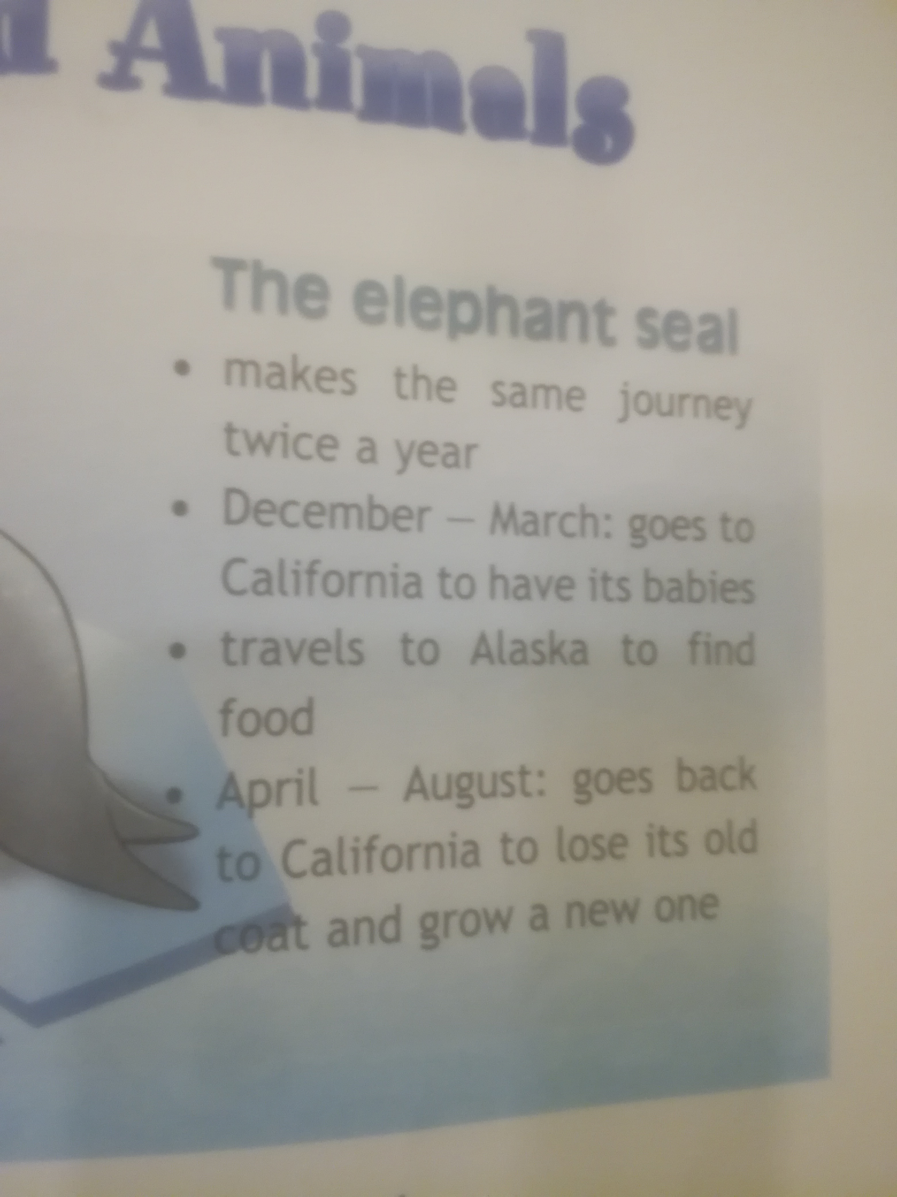 1. twice a year.2.december till march, its babies.3.Alaska,food.4.April till August, California, coat , grow a new one.