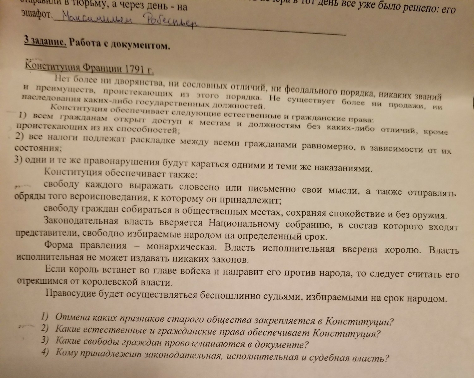 Крайне истощенная государственная казна, обремененная громадными долгами, непомерное налоговое бремя лежащее тяжким грузом на среднем и низшем классе на фоне обширных привилегий дворянства и духовенства, злоупотребление административных органов, которые погрязли в бюрократии и коррупции, все это вместе и привело к созданию революционной ситуации. ... 3сентября 1791 года учредительное собрание утвердило конституцию 1791года, которая уже юридически закрепила изменения государственно-политического строя Франции. С этого момента начинается конституционная история Франции. Конституция 1791 года закрепила конституционную монархию. Король принял присягу о верности конституции.