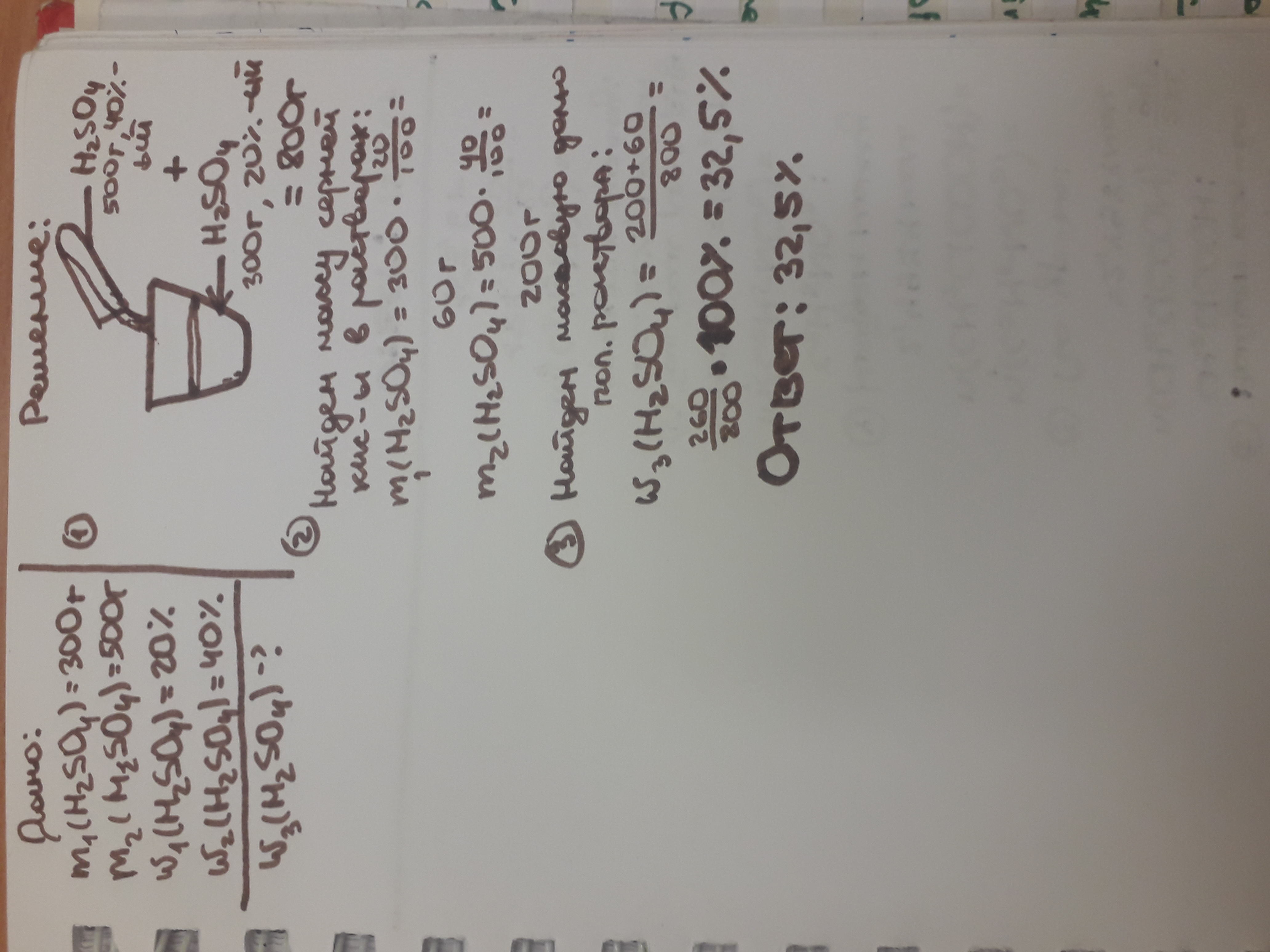 Массовая доля (w%) серной кислоты, полученного смешением раствора серной кислоты массами 300 и 500г с массовым долями 20 и 40%