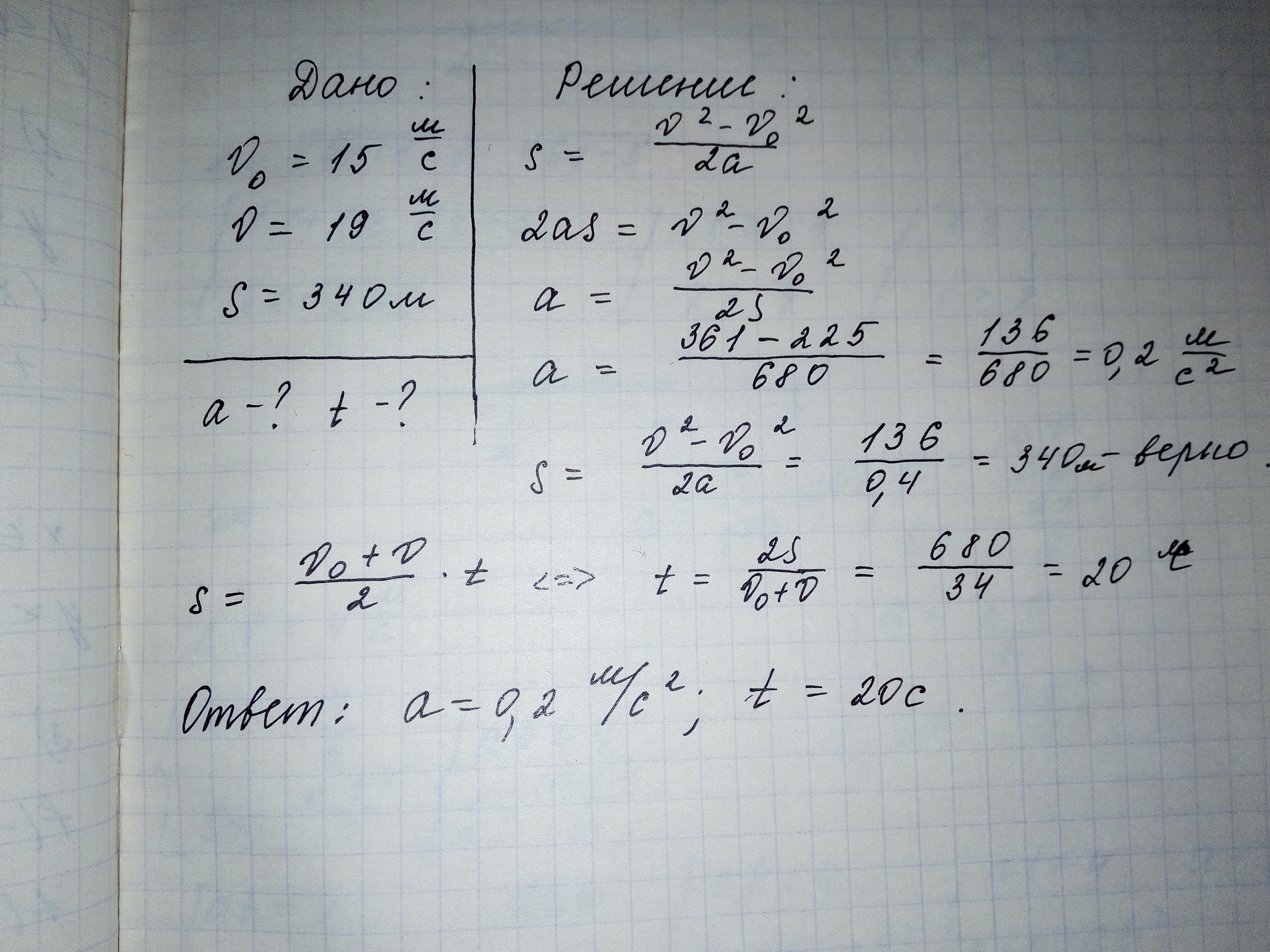 скорость поезда, движущегося под уклон , возросла с 15м/с до 19м/с . поезд прошёл при этом путь 340 м. С каким ускорением двигался поезд и сколько времени продолжалось движение под уклон?