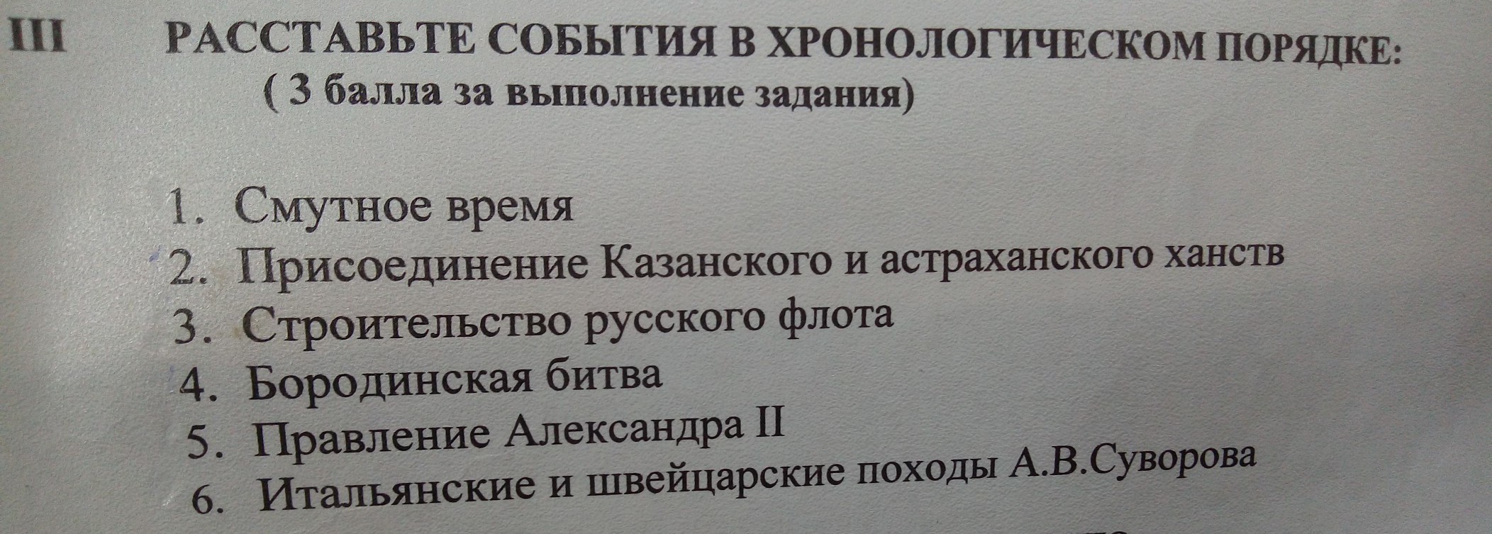 Значит хронология с самого раннего до самого позднего: первое было, несомненно, присоединение казанского и астраханского ханств, дальше была смута, далее строительство русского флота, дальше итальянские и швейцарские походы Суворова, дальше бородинская битва и наконец правление Александра II.