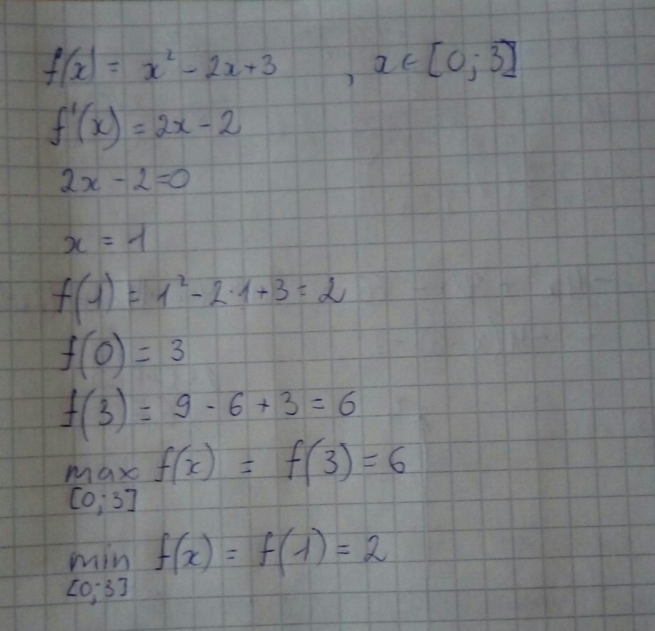 знайдіть найбільше і найменше значення функції f(x)=x^-2x+3 на проміжку [0;3] P.S ^-ЦЕ КВАДРАТ Х В КВАДРАТІ