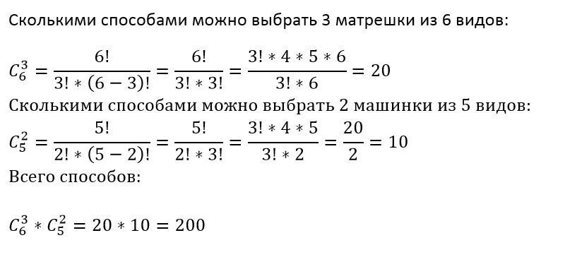 в магазине есть 6 разных видов матрешек и 5 видов машинок. Малыш решил купить пять игрушек, среди которых должно быть не более 3 видов матрешек. сколько различных наборов, удовлетворяющих малышу, можно составить?