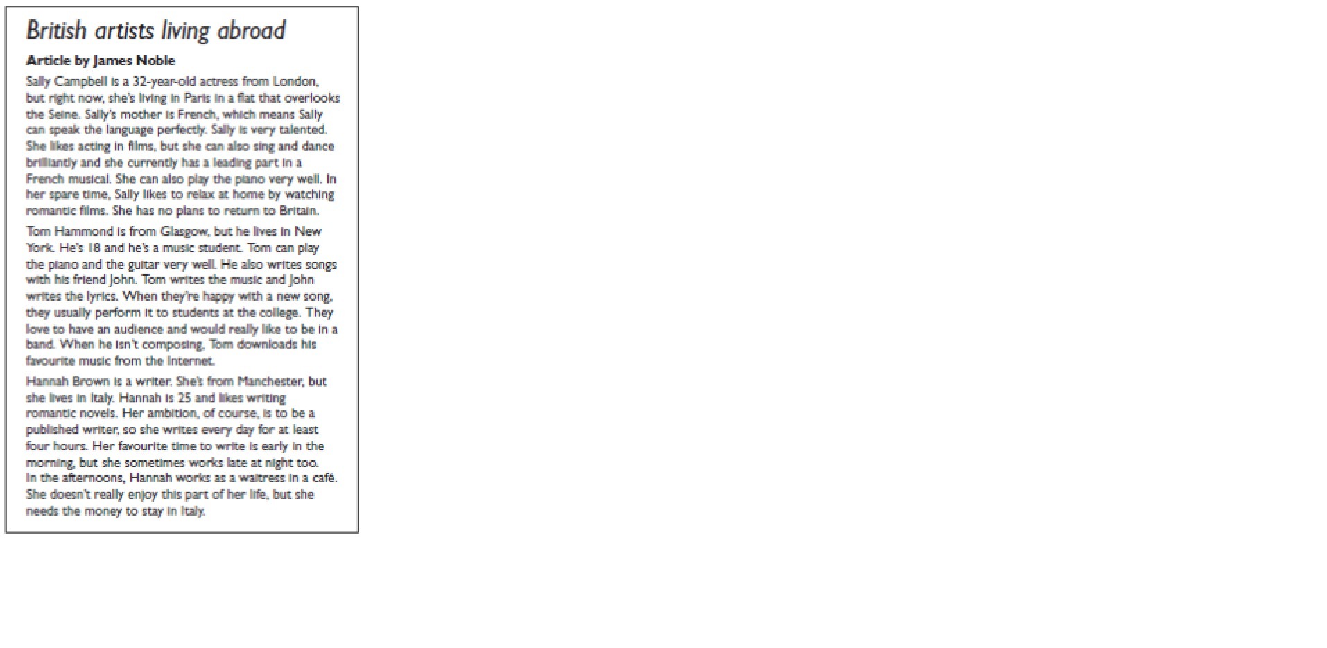 he's irish.he live with family in Dublin.he studies engineeering at university.he has got a long blach hair and dark eyes.he is very intelligent.he like listening music and going to the cinema.he always to go to the cinema at weejends.he doesn't drink,but he smokes.his favourite time like going out in the evening