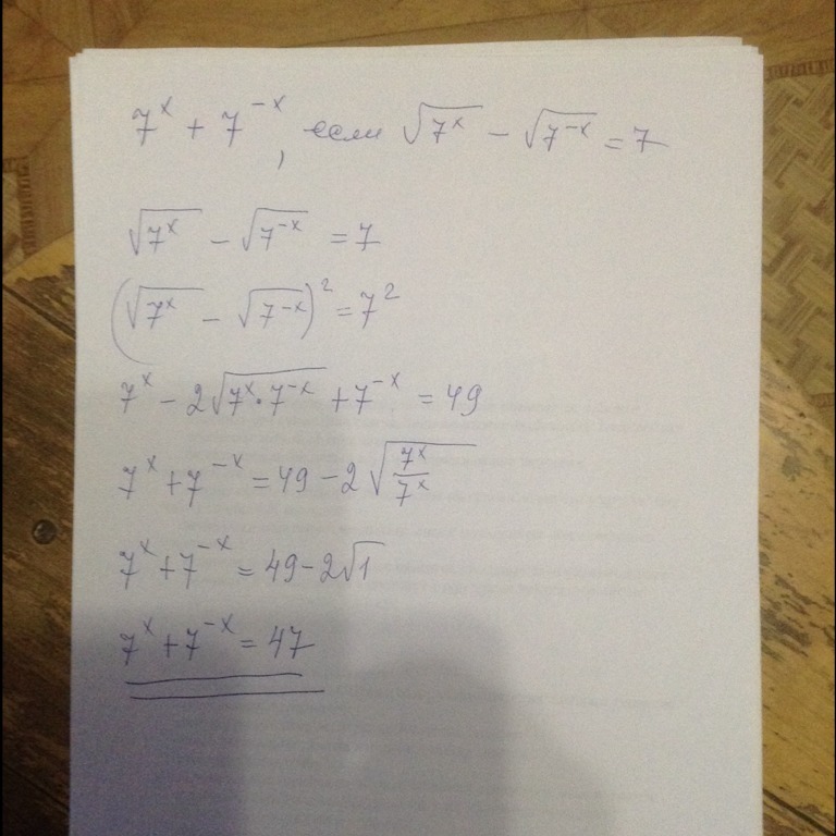 Смотри ))))))))))))))))))))))) 7×+7-×=? если √7×-√7-×=7 (√7×-√7-×)²=7² 7×-2√7× * √7-× +7-×=49 7× + 7-×=49+ 2 √1 7×+7-×=51