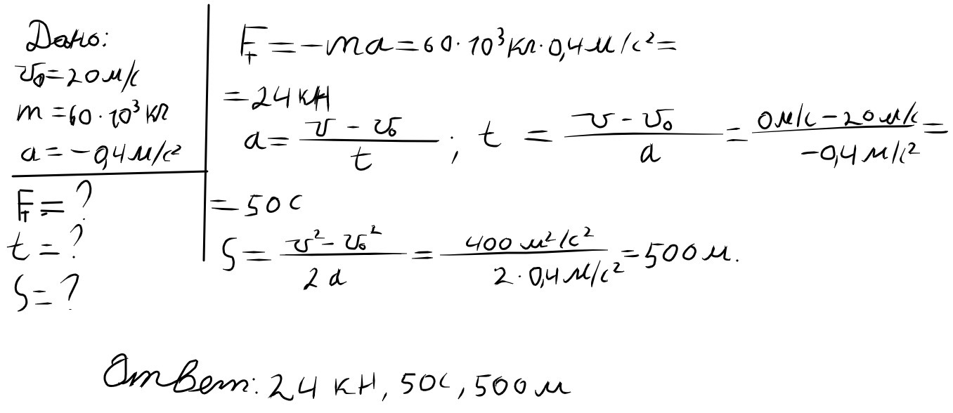 F=m*a=60*10^3*0,4=24*10^3 H F*S=m*V^2/2 S=m*V0^2/2*F=60*10^3*20^2/2*24*10^3=500 м t=V0/a=20/0,4=50 c