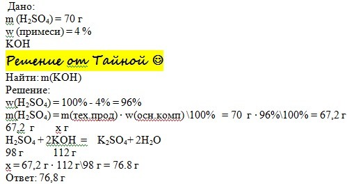 Сколько граммов гидроксида калия потребуется для взаимодействия с 70г серной кислоты, содержащей 4% примесей ?