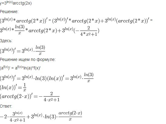 Найти производные функций: y=3^(ln x)*arcctg 2x Помогите пожалуйста)